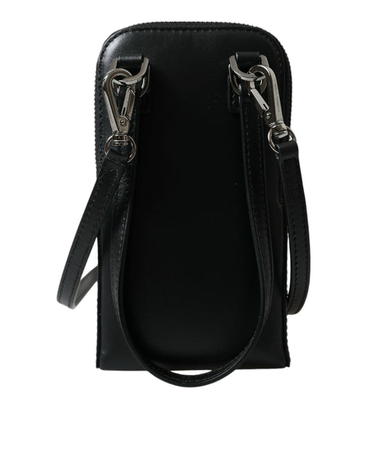 Dolce & Gabbana Black Leather Zip Around Logo Print Lanyard Strap Wallet