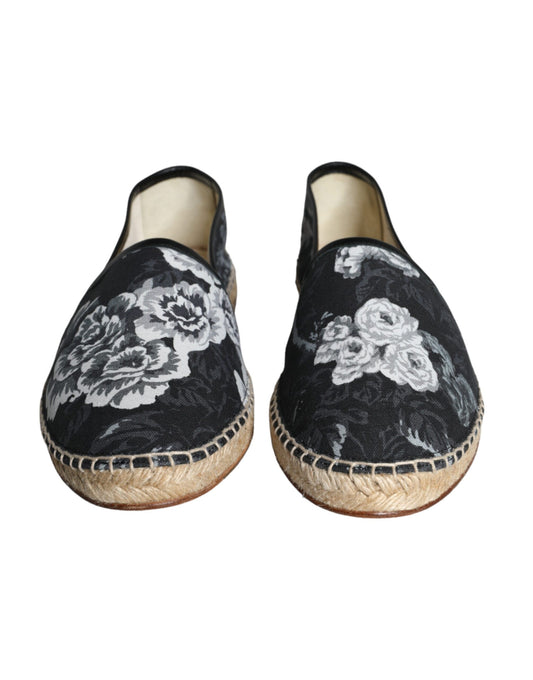 Dolce & Gabbana Black Floral Cotton Leather Espadrilles Shoes