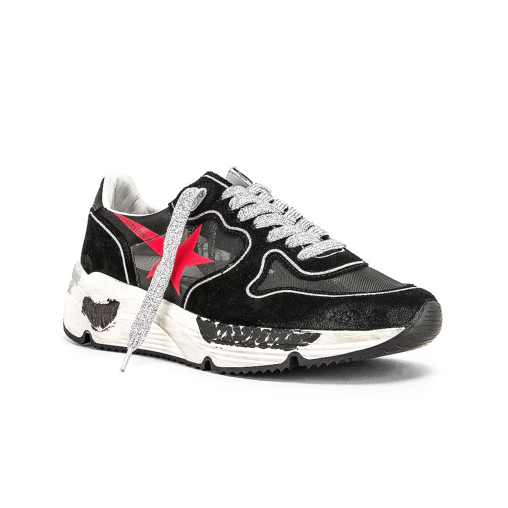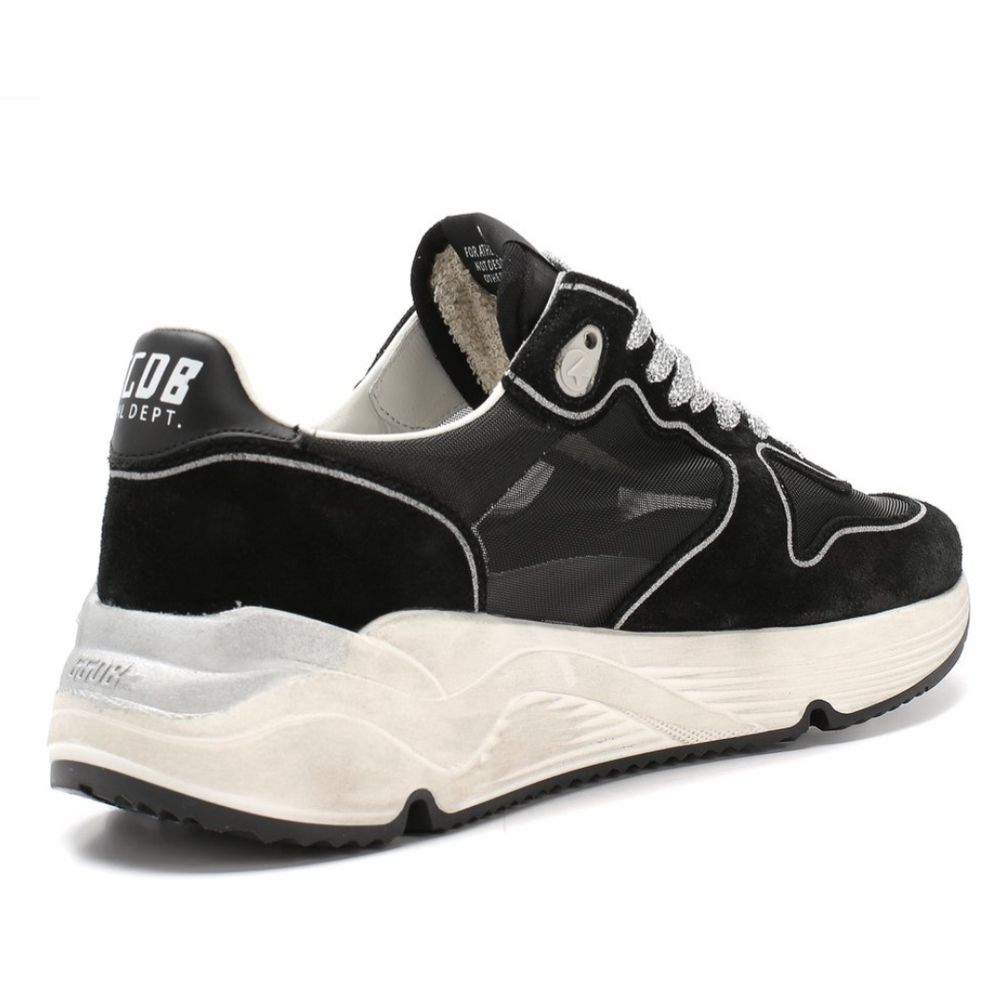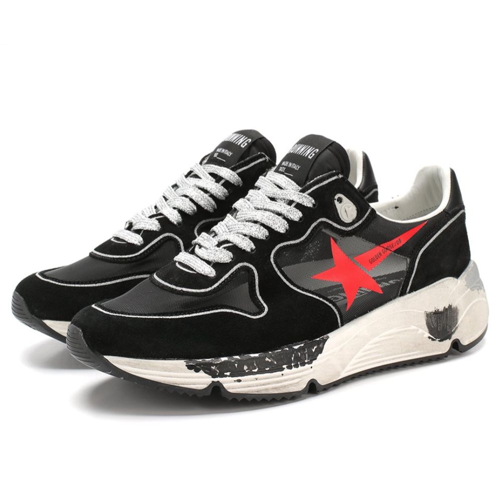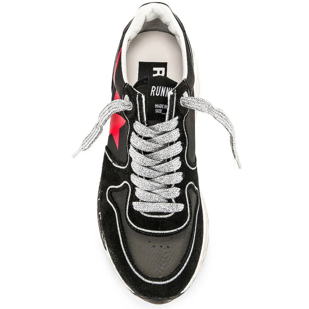 Golden Goose running sneakers in black suede with parts in technical mesh fabric, silver glitter laces, red star logo print, rubber sole with used effect and marker-stained effect