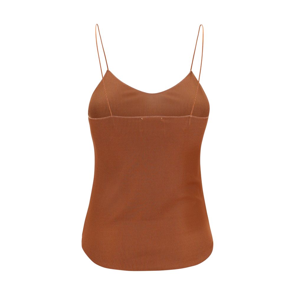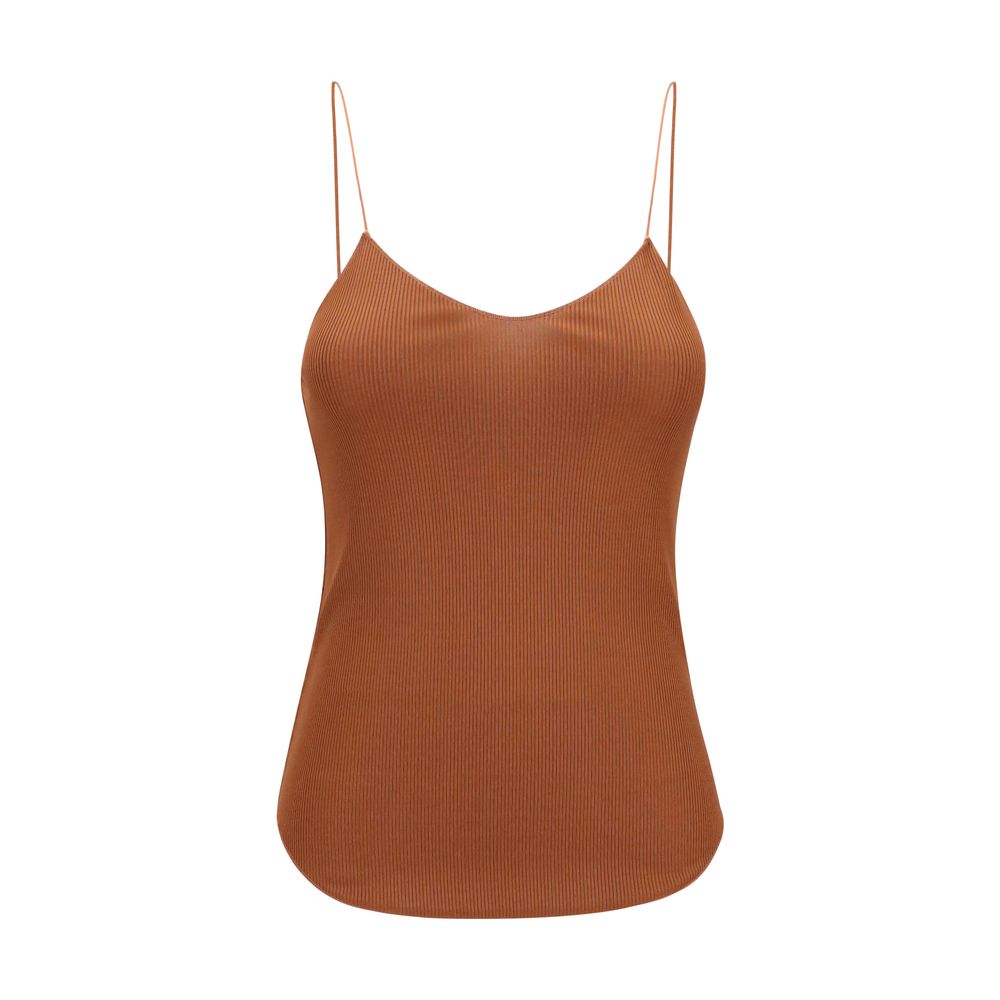 Forte_Forte’s Ribbed Top is an essential and sophisticated garment designed to naturally enhance the silhouette. Made from a fine-ribbed fabric, it features a slightly V-neckline and thin straps that add elegance and lightness to the look. The asymmetric hemline adds a modern and dynamic detail, making the top perfect either as an under-layer or worn alone for a minimal, feminine style.