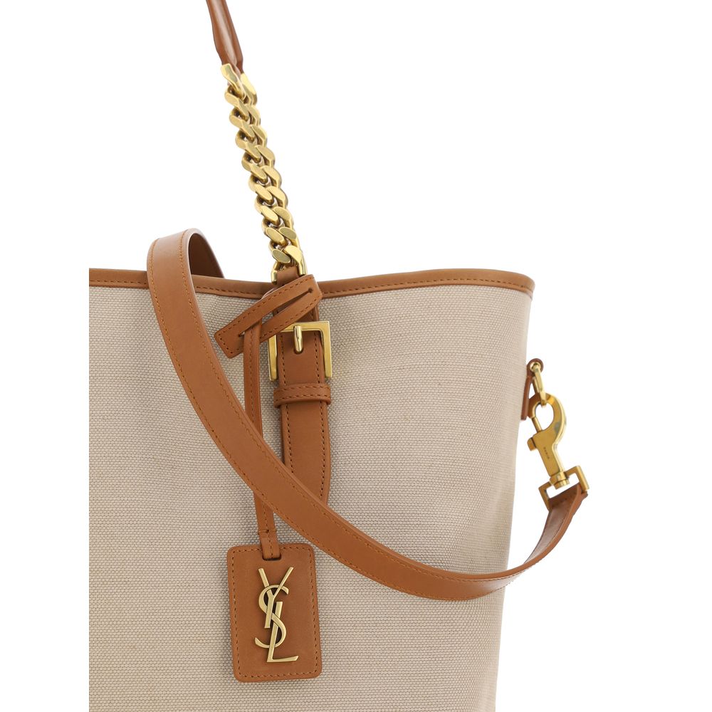 Fabric Shopping Shoulder Bag by Saint Laurent, double leather handles with contrasting chain and adjustable straps, leather keychain charm attached to the base of the shoulder strap with three-dimensional plaque and iconic embossed YSL logo, large interior compartment, interior slit pocket with zipper for closure.
